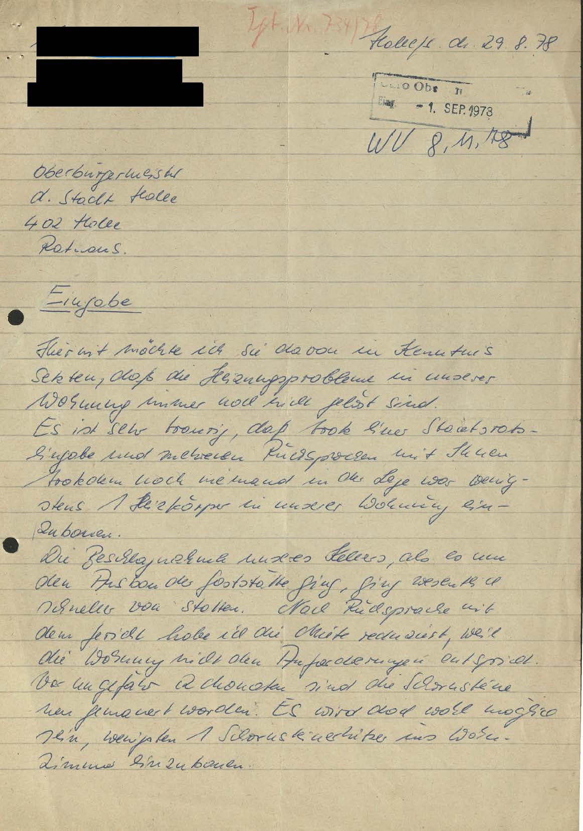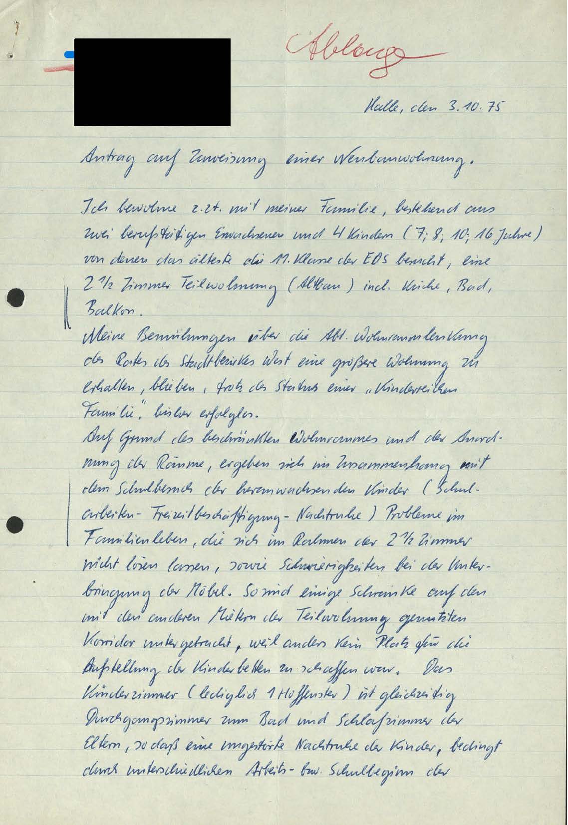 Trotz erheblicher staatlicher Anstrengungen blieb Wohnraum knapp. Altstädte verfielen, die Wohnsituation vieler Menschen verschlechterte sich spürbar. Ein Weg, den Bürger:innen gingen, um an eine der begehrten Neubauwohnungen zu gelangen, waren ,Eingaben‘ an staatliche Institutionen. Die Eingabe eines Familienvaters aus Halle zeigt, wie solche Schreiben verfasst waren. Darin schildert er die beengte Wohnsituation seiner Familie und versucht so, seinen Antrag auf besseren Wohnraum zu begründen.
