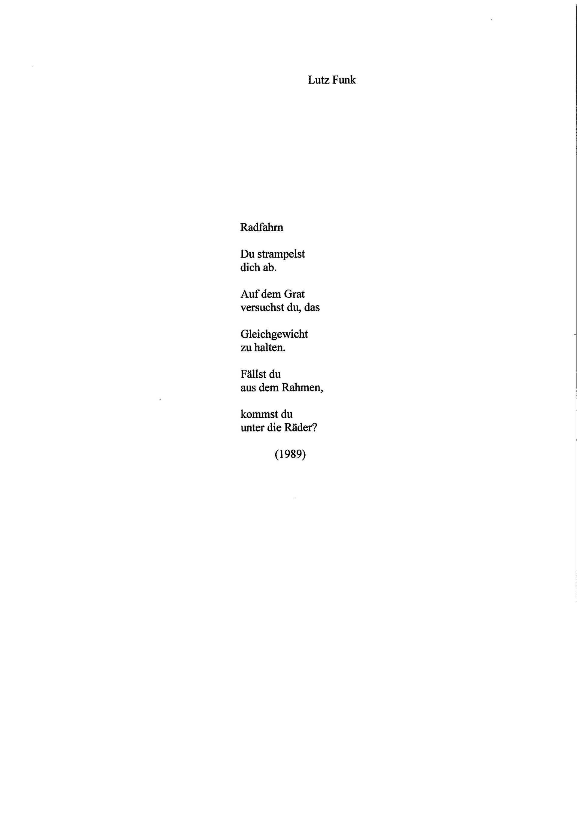 ,Sich abstrampeln‘, ,aus dem Rahmen fallen‘, ,unter die Räder kommen‘ – Ende der 1980er Jahre nahmen die Krisenerfahrungen vieler Menschen im Alltag zu. Auch in den Texten der Schreibenden Arbeiter wurde diese Unsicherheit zunehmend literarisch verarbeitet. Das Gedicht „Radfahrn" ist ein Beispiel dafür.