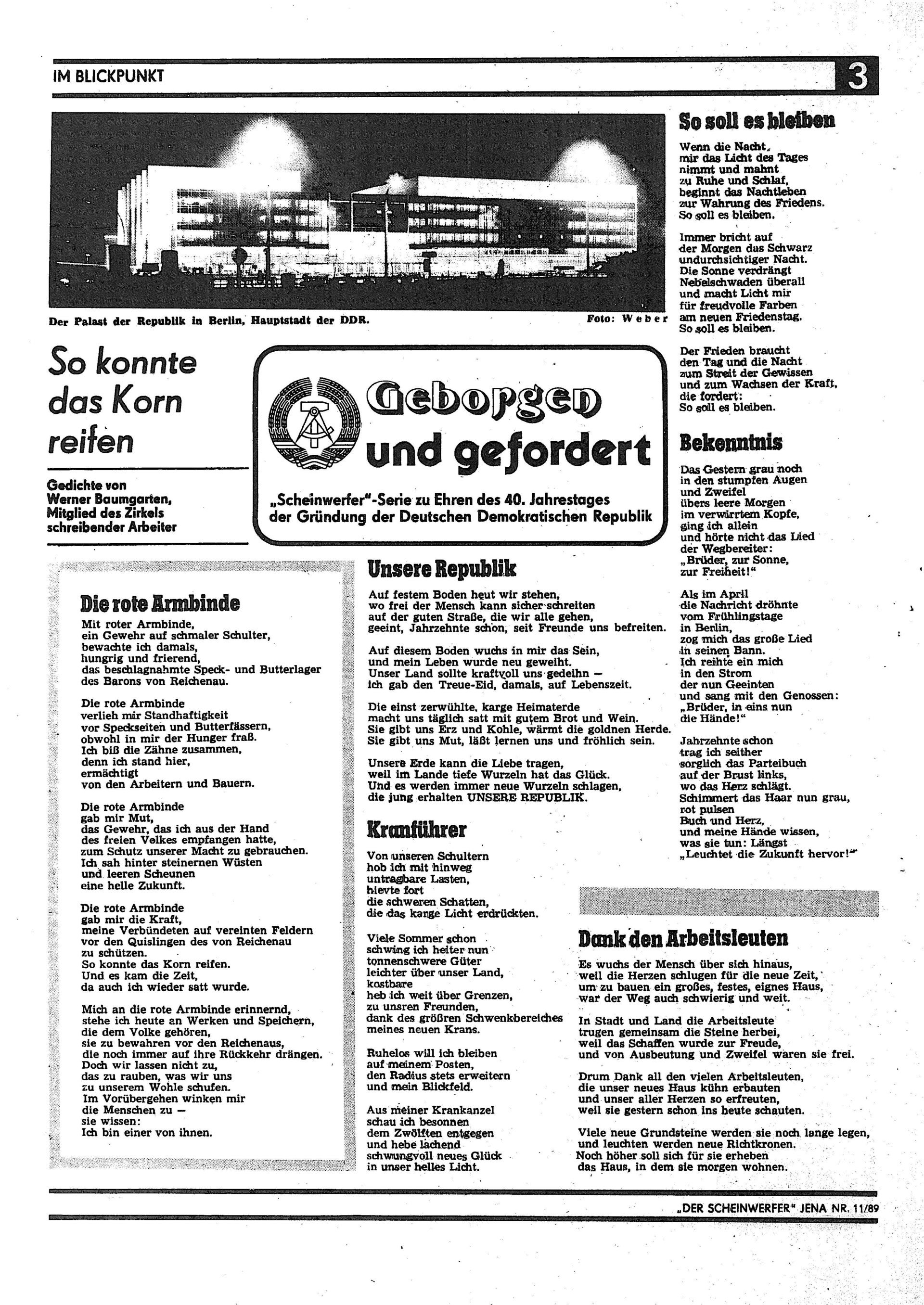 Die DDR – ein Traumstaat? Nicht anders sind die Gedichte des Schreibenden Arbeiters Werner Baumgarten zu begreifen, in denen er noch im März 1989 auf einer Sonderseite den kommenden 40. Jahrestag der DDR feiert. Pathetisch drückt er seine tiefe Dankbarkeit gegenüber der SED aus, lobt die Arbeiterklasse als die treibende Kraft des DDR-Aufbaus, bekennt sich zu den Idealen des Sozialismus – und ruft zum unerschütterlichen Mitgestalten der sozialistischen Gesellschaft auf.