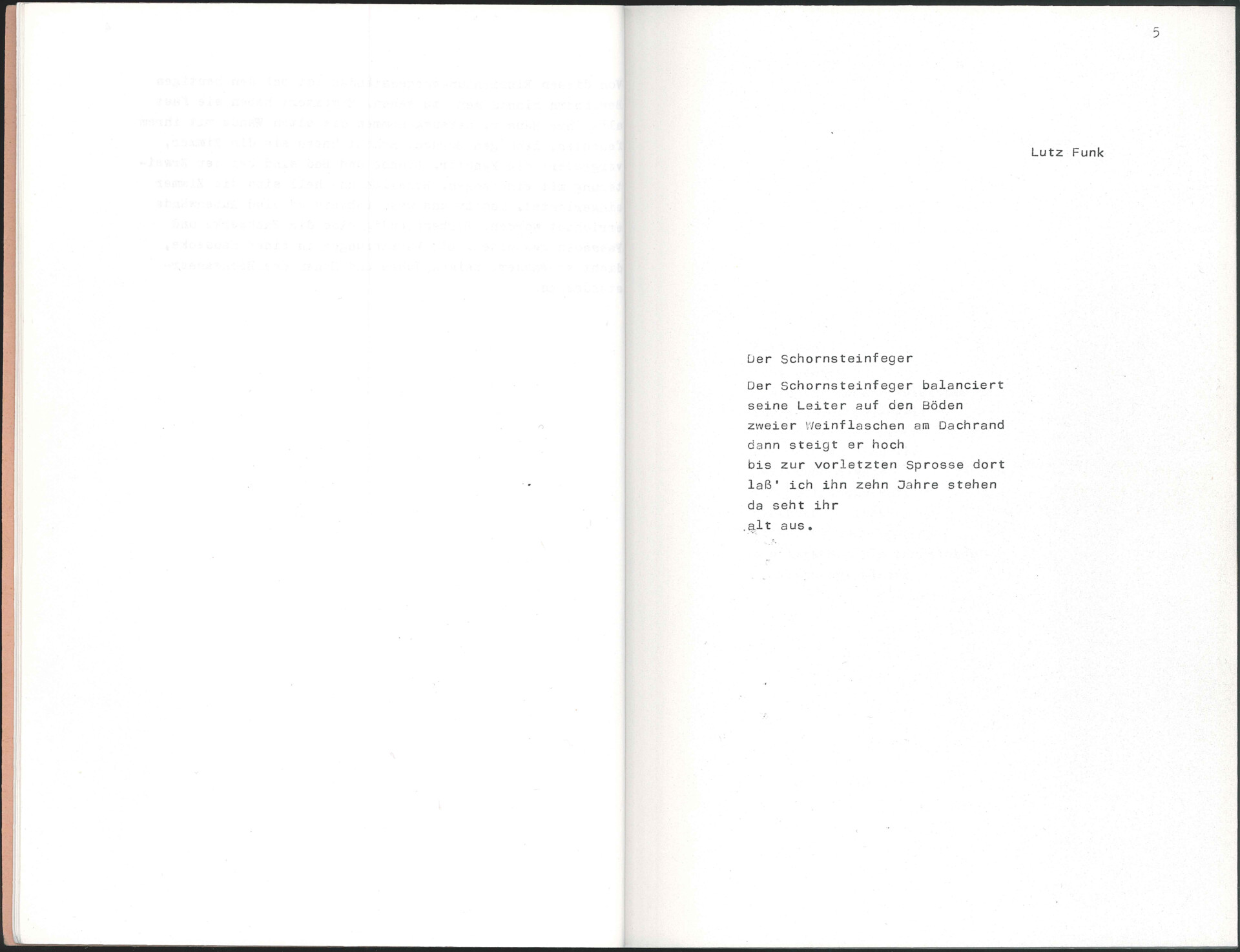 Ein Schornsteinfeger balanciert – und mit ihm die Leserschaft: „da seht / ihr alt aus.“ Nach dem Umbruch entdeckten viele Schreibende Arbeiter das Schreiben neu, spielten mit Sprache und formulierten ihr gewandeltes Selbstverständnis als Autor:in. Dieses Gedicht kann als literarische Selbstermächtigung verstanden werden: Das lyrische Ich erschafft seine Welt, gibt sich als Poet zu erkennen und spielt mit seiner Figur wie auch dem Publikum.