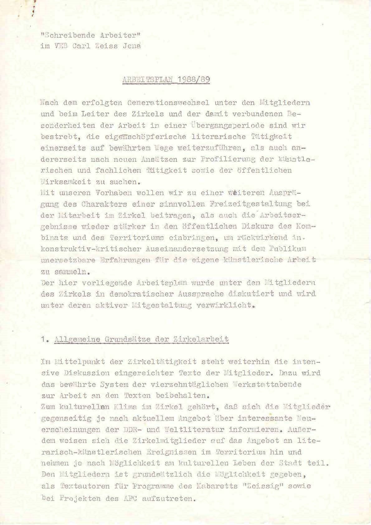 Arbeitsplan des Zirkels Schreibender Arbeiter Jena (1988/89)