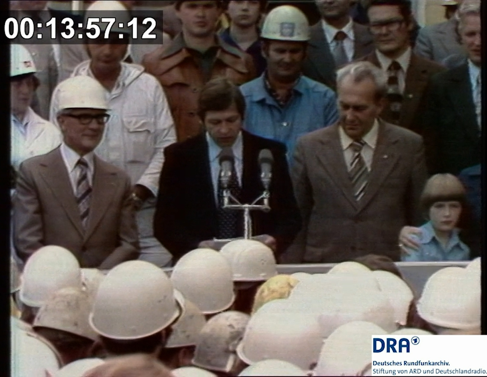 Wie inszenierte der Staat seine Wohnungsbaupolitik? Einen exemplarischen Einblick bietet ein Beitrag der DDR-Nachrichtensendung „Aktuelle Kamera“ aus dem August 1978: Feierlich übergibt der Staatschef Erich Honecker eine gerade fertiggestellte Jubiläumswohnung an eine Familie.
