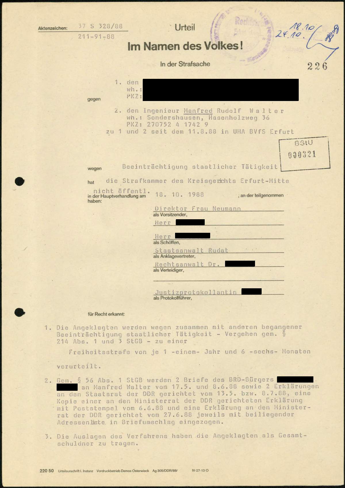 Sein jahrelanges Ausreiseersuchen führte schlussendlich zu seiner Verhaftung. Das Bezirksgericht Erfurt verurteilte ihn wegen „zusammen begangener Beeinträchtigung staatlicher Tätigkeit“ – ein politischer Straftatbestand – zu eineinhalb Jahren Gefängnis. Aus der Haft heraus wurde Manfred Walter im März 1989 in die Bundesrepublik freigekauft.