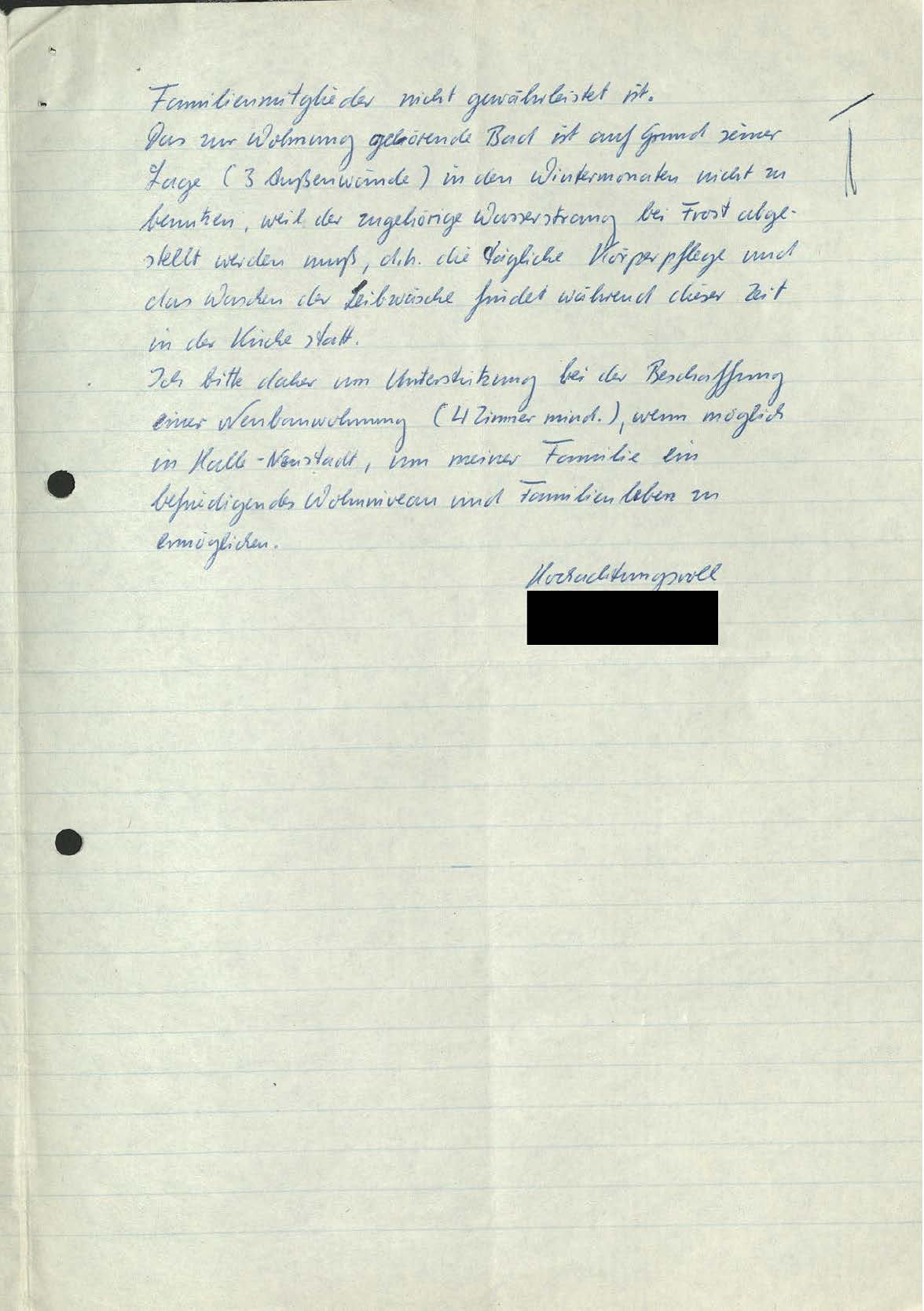 Ich bitte daher um die Unterstützung bei der Beschaffung einer Neubauwohnung (4 Zimmer mind.), wenn möglich in Halle-Neustadt, um meiner Familie ein befriedigendes Wohnniveau und Familienleben zu ermöglichen.