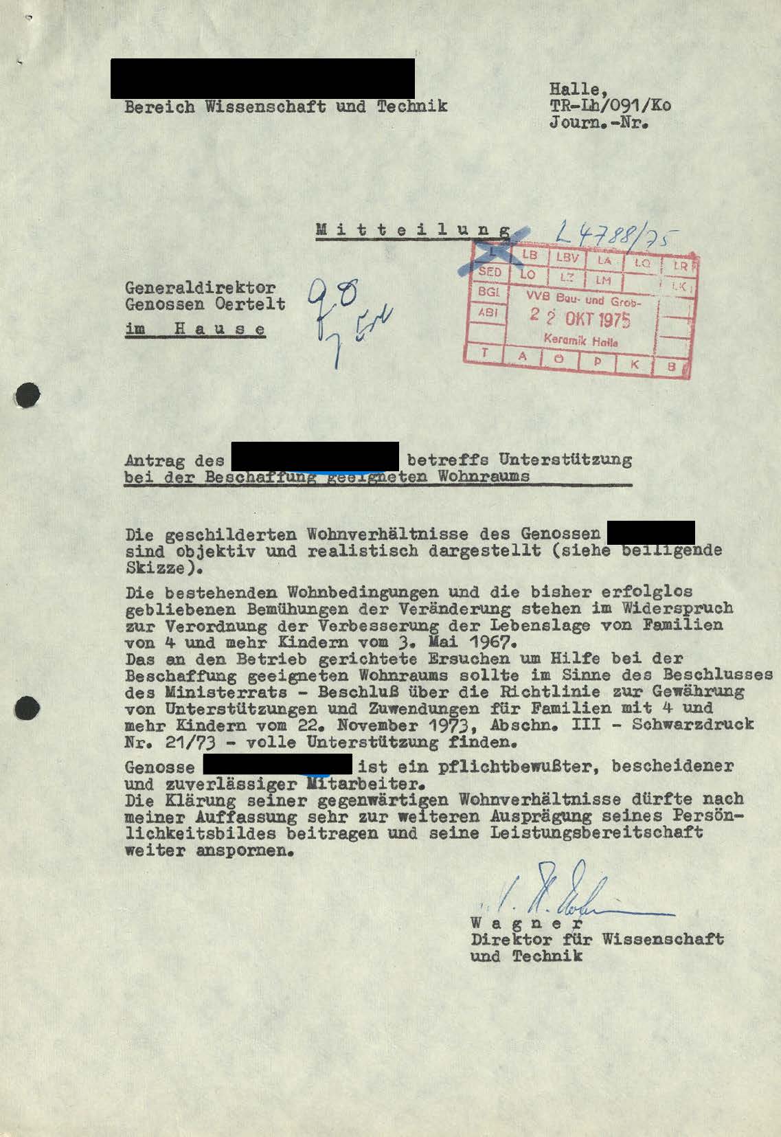 Der Antrag des Familienvaters H. erhielt Unterstützung durch seinen Vorgesetzten. Dies belegt ein weiteres Schreiben vom 22. Oktober 1975. Die maschinengeschriebene Erklärung wurde an die Vereinigung Volkseigener Betriebe (VVB) Bau- und Grobkeramik, Bereich Wissenschaft und Technik gesandt. Unterschrieben wurde es vom Direktor. Familienvater H. wird in diesem Schreiben als „pflichtbewusster, bescheidener und zuverlässiger Mitarbeiter“ beschrieben. Das zeigt, dass auch in der DDR persönliche Netzwerke durchaus dienlich sein konnten, um individuelle Interessen durchzusetzen.