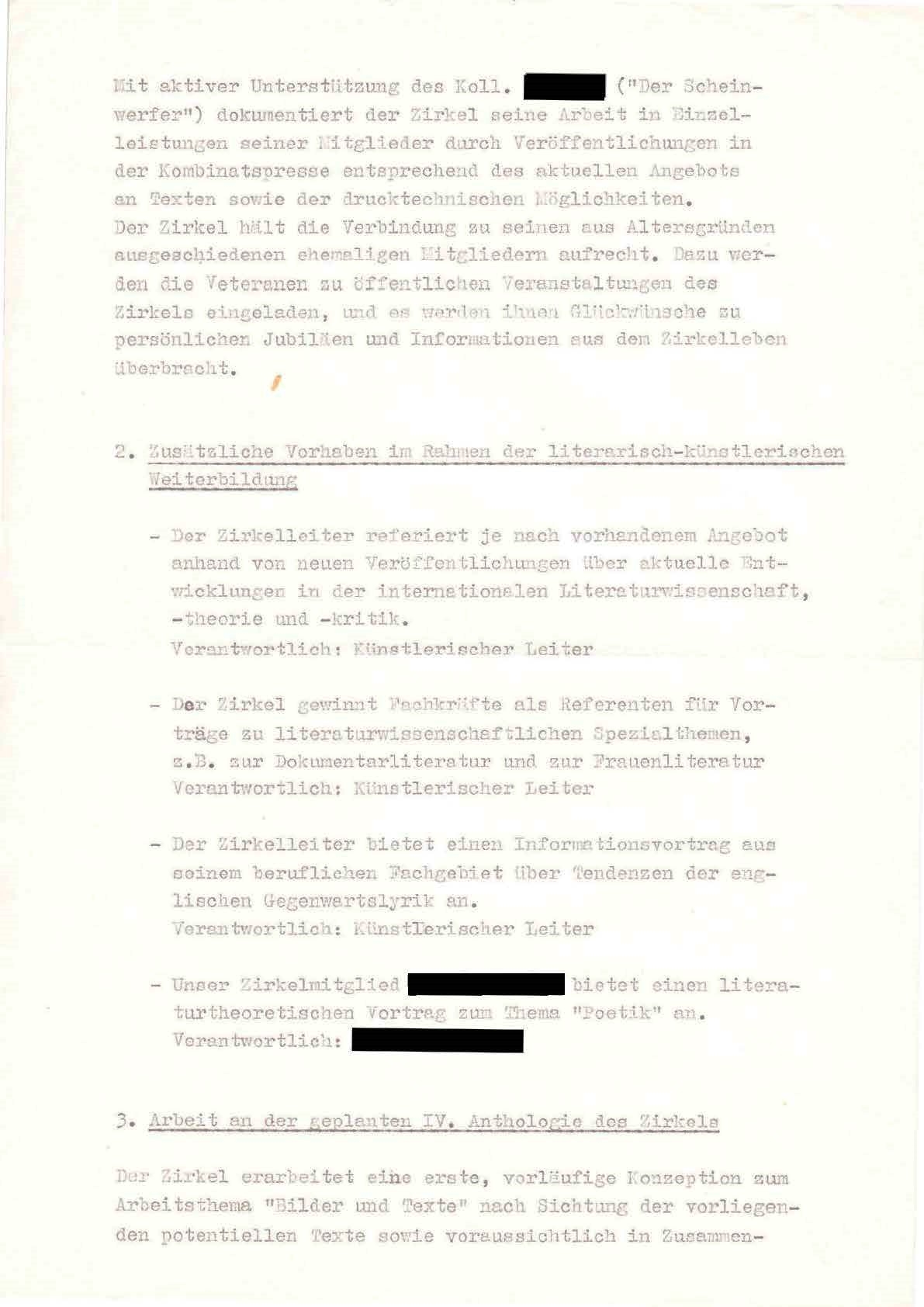 Mit aktiver Unterstützung des Koll. [geschwärzt] („Der Scheinwerfer“) dokumentiert der Zirkel seine Arbeit in Einzelleistungen seiner Mitglieder durch Veröffentlichungen in der Kombinatspresse entsprechend des aktuellen Angebots an Texten sowie der drucktechnischen Möglichkeiten. Der Zirkel hält die Verbindung zu seinen aus Altersgründen ausgeschiedenen ehemaligen Mitgliedern aufrecht. Dazu werden die Veteranen zu öffentlichen Veranstaltungen des Zirkels eingeladen, und es werden ihnen Glückwünsche zu Persönlichen Jubiläen und Informationen aus dem Zirkelleben überbracht.