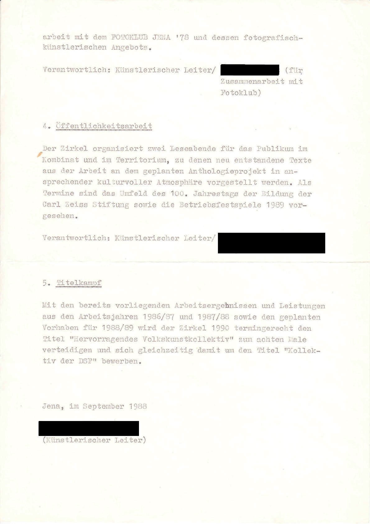 1987 übernimmt ein neuer Leiter den Zirkel Schreibender Arbeiter des VEB Carl Zeiss Jena. Unter seiner Federführung entsteht der Arbeitsplan für die Jahre 1988/89. Das Dokument gibt einen Einblick in die strukturelle und ideologische Neuausrichtung des Zirkels zu dieser Zeit. Sichtbar wird, wie sich die Gruppe Ende der 1980er Jahre vorsichtig von den kulturpolitischen Erwartungen des Staates und dem ideologischen Rahmen der Bewegung Schreibender Arbeiter löst.