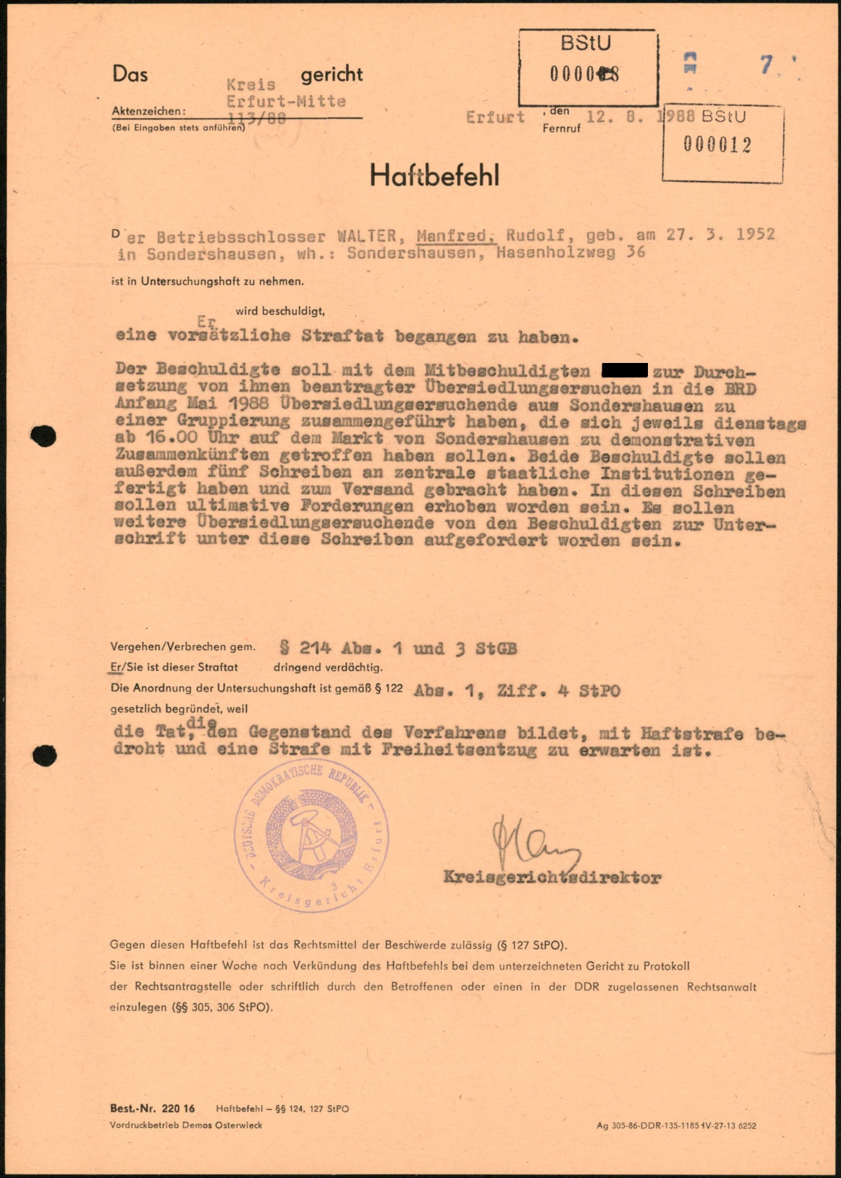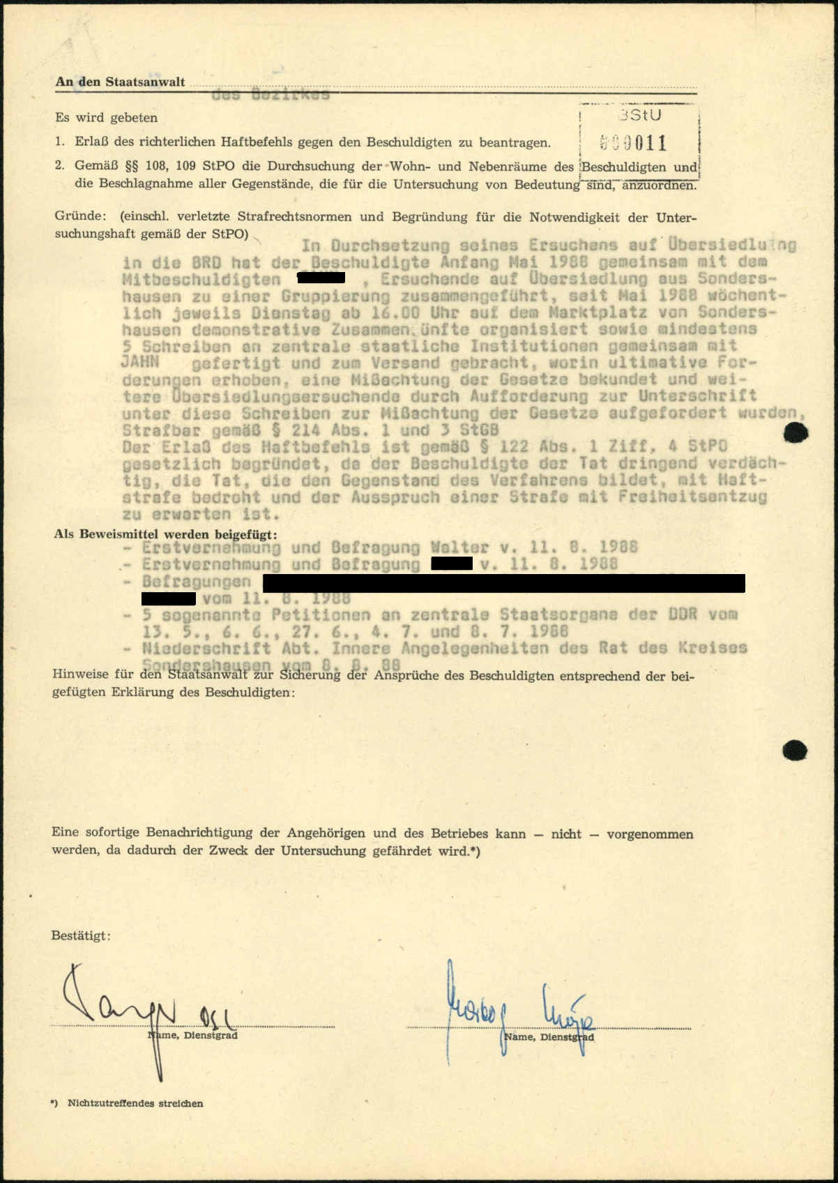 Der Beschuldigte soll mit dem Mitbeschuldigten [geschwärzt] zur Durchsetzung von ihnen beantragter Übersiedlungsersuchen in die BRD Anfang Mai 1988 Übersiedlungsersuchende aus Sondershausen zu einer Gruppierung zusammengeführt haben, die sich jeweils dienstags ab 16.00 Uhr auf dem Markt von Sondershausen zu demonstrativen Zusammenkünften getroffen haben sollen. Beide Beschuldigten sollten außerdem fünf Schreiben an zentrale staatliche Institutionen gefertigt haben und zum Versand gebracht haben. In diesen Schreiben sollen ultimative Forderungen erhoben worden sein. Es sollen weitere Übersiedlungsersuchende von den Beschuldigten zur Unterschrift unter diese Schreiben aufgefordert worden sein. [Begründung eingesetzt]
