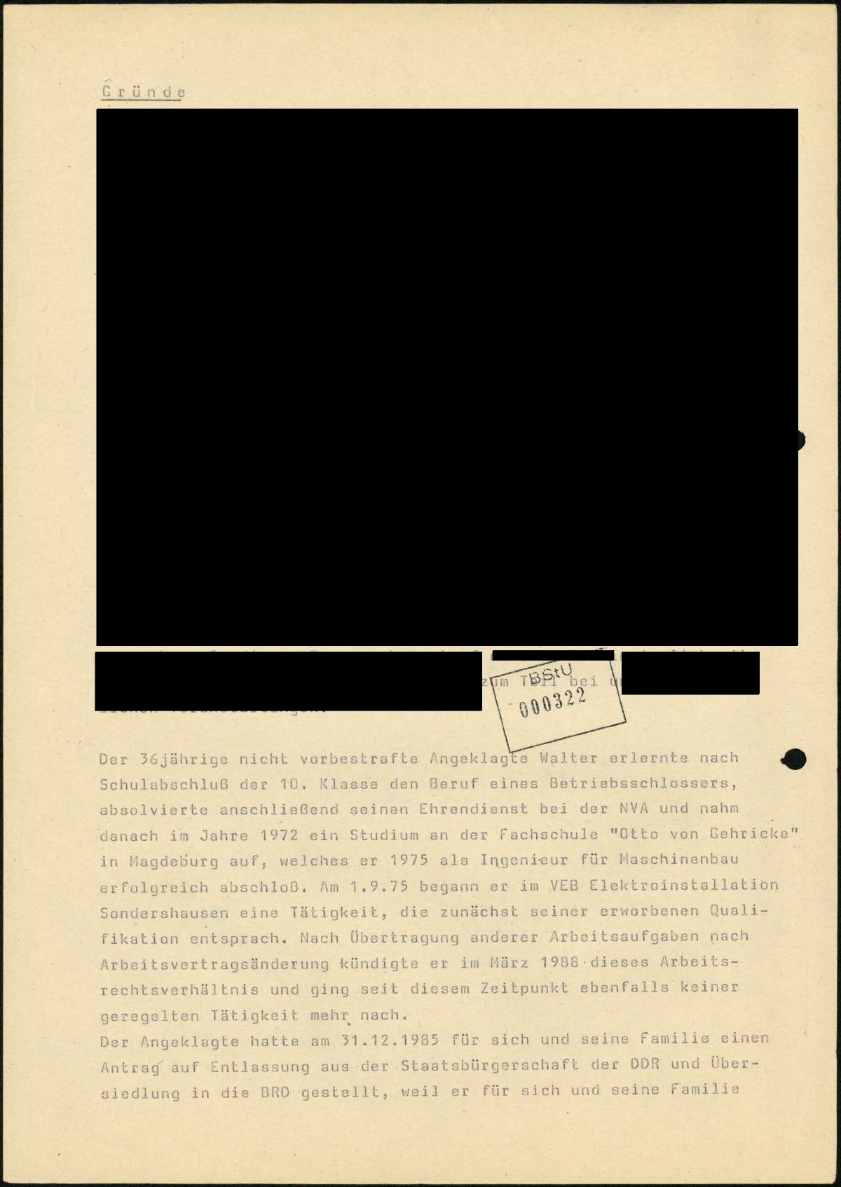 Der 36jährige nicht vorbestrafte Angeklagte Manfred Walter erlernte nach Schulabschluss der 10. Klasse den Beruf eines Betriebsschlossers, absolvierte anschließend seinen Ehrendienst bei der NVA und nahm danach im Jahr 1972 ein Studium an der Fachhochschule „Otto von Gehricke“ in Magdeburg auf, welches er 1975 als Ingenieur für Maschinenbau erfolgreich abschloss. Am 1.9.75 begann er im VEB Elektroinstallation Sondershausen eine Tätigkeit, die zunächst seiner erworbenen Qualifikation entsprach. Nach Übertragung anderer Arbeitsaufgaben nach Arbeitsvertragsänderung kündigte er im März 1988 dieses Arbeitsrechtsverhältnis und ging seit diesem Zeitraum ebenfalls keiner geregelten Tätigkeit mehr nach.