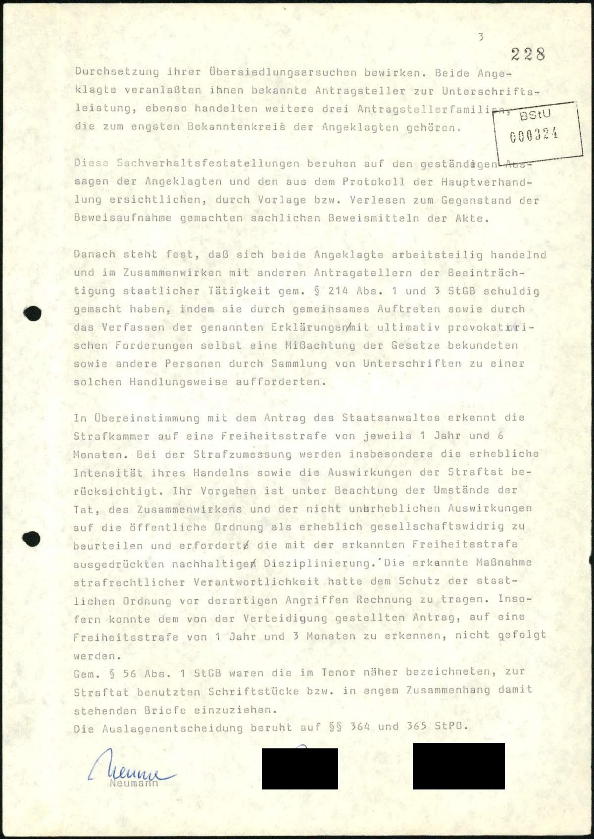 Der Angeklagte hatte am 31.12.1985 für sich und seine Familie einen Antrag auf Entlassung aus der Staatsbürgerschaft der DDR und Übersiedlung in die BRD gestellt, weil er für sich und seine Familie in der BRD größere Entfaltungsmöglichkeiten, auch aufgrund seiner vorwiegend religiösen Erziehung, sieht und darüber hinaus mit seinem in der BRD lebenden Bruder familiär enger zusammenleben möchte. Sein Übersiedlungsersuchen wurde am 20.4.1988 abschlägig bearbeitet.