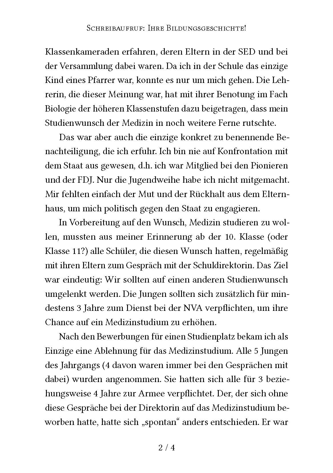 In Vorbereitung auf den Wunsch, Medizin studieren zu wollen, mussten aus meiner Erinnerung ab der 10. Klasse (oder Klasse 11?) alle Schüler, die diesen Wunsch hatten, regelmäßig mit ihren Eltern zum Gespräch mit der Schuldirektorin. Das Ziel war eindeutig: Wir sollten auf einen anderen Studienwunsch umgelenkt werden. Die Jungen sollten sich zusätzlich für mindestens 3 Jahre zum Dienst bei der NVA verpflichten, um ihre Chance auf ein Medizinstudium zu erhöhen.