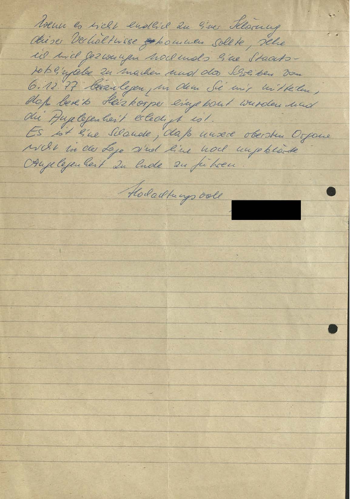 Wenn es nicht endlich zu einer Klärung dieser Verhältnisse kommen sollte, sehe ich mich gezwungen nochmals eine Staatsratseingabe zu machen und das Schreiben vom 6.12.77 beizulegen, in dem Sie mir mitteilen, daß bereits Heizkörper eingebaut wurden und die Angelegenheit erledigt ist.