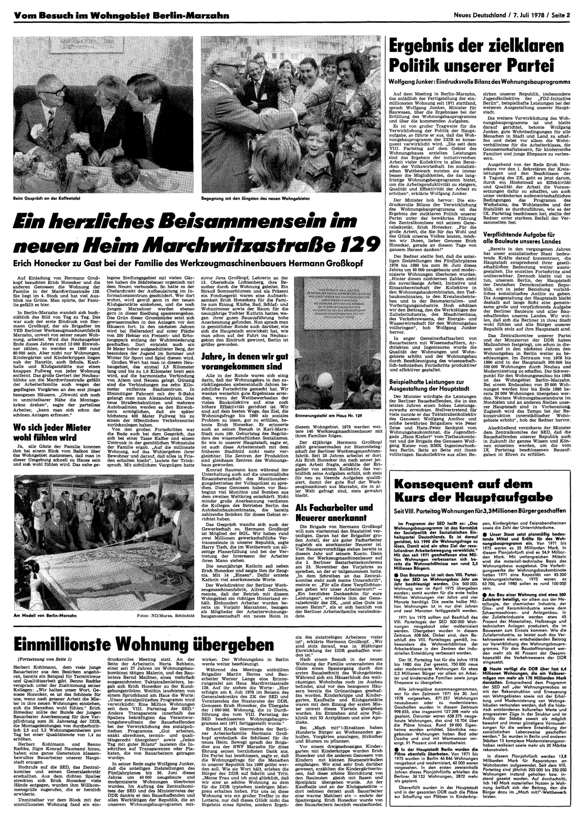 Die einmillionste Wohnung wurde an eine Berliner Arbeiterfamilie übergeben, in: Neues Deutschland vom 07.07.1978, S. 2